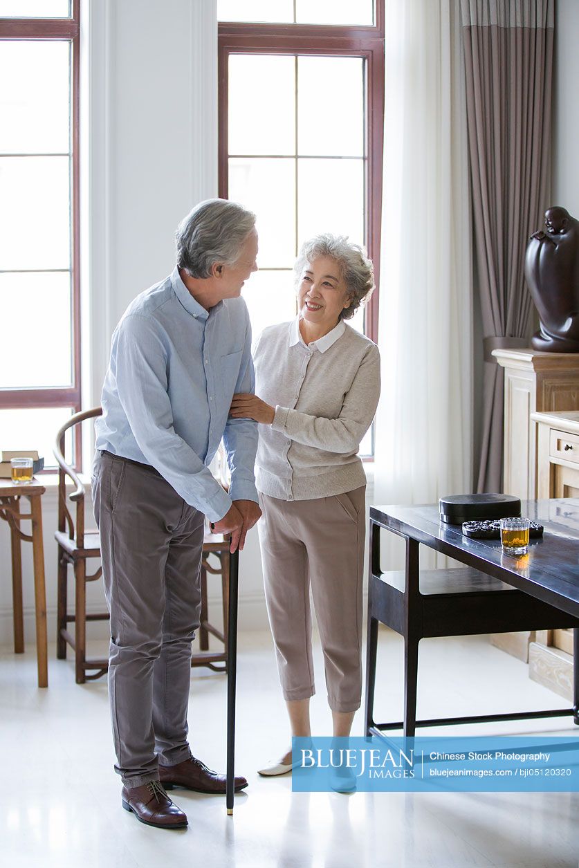 Senior Couple , Chinese Ethnicity , Care , Home , Senior Adult , Aging Process Retirement Talking Illness Crutch Waist Cheerful Face To Face Couple Heterosexual Couple Husband Wife People Two People Women Men Asian Ethnicity Adult Adults Only 70-79 Years Senior Women Senior Men 65-69 Years Fragility Special Needs Assistance Affectionate Furniture Ming Style Furniture Close To Domestic Life Enjoyment Expressing Positivity Happiness Joy Leisure Lifestyles Togetherness Table Chair Wood White Hair Gray Hair Casual Clothing Day Serene People Indoors Window Home Interior Bending Holding Looking Away Smiling Standing Toothy Smile China East Asia Asia Beijing Photography Color Image Focus On Foreground Front View Selective Focus Full Length Vertical Support Wicker 老年夫妇 中国人 关爱 家 老年人 衰老过程 退休 说话 疾病 拐杖 腰部 快乐 面对面 情侣 异性恋情侣 丈夫 妻子 人 两个人 女人 男人 亚洲人 成年人 仅成年人 70到79岁 老年女性 老年男人 65到69岁 脆弱 特殊需求 协助 深情的 家具 明式家具 亲密 家庭生活 享乐 表现积极 幸福 欢乐 休闲 生活方式 相伴 桌子 椅子 木制 白发 灰发 休闲装 白天 和蔼之人 室内 窗户 住宅内部 弯腰 拿着 不看镜头 微笑的 站着 露齿一笑 中国 东亚 亚洲 北京 摄影 彩色图片 前景聚焦 正面图 选择对焦 全身像 竖片 支持 柳条 ......